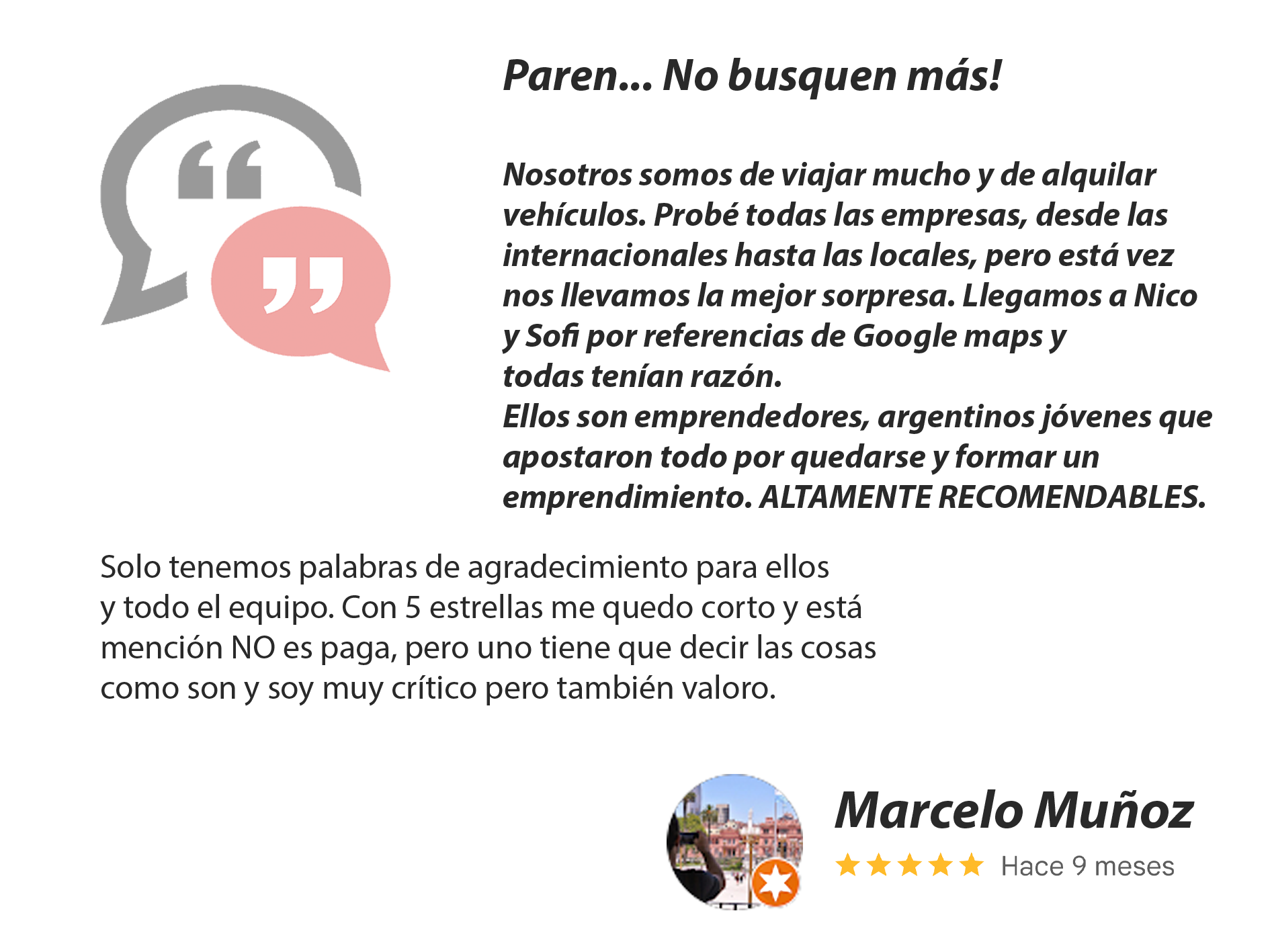 Súper recomendables! La atención de ambos, estuve gestionando todo con Nico, todo excelente buena comunicación, los dos autos que alquilé en la semana de forma excelente tanto para la entrega como el retiro. Si van alquilar, ni lo duden un segundo.